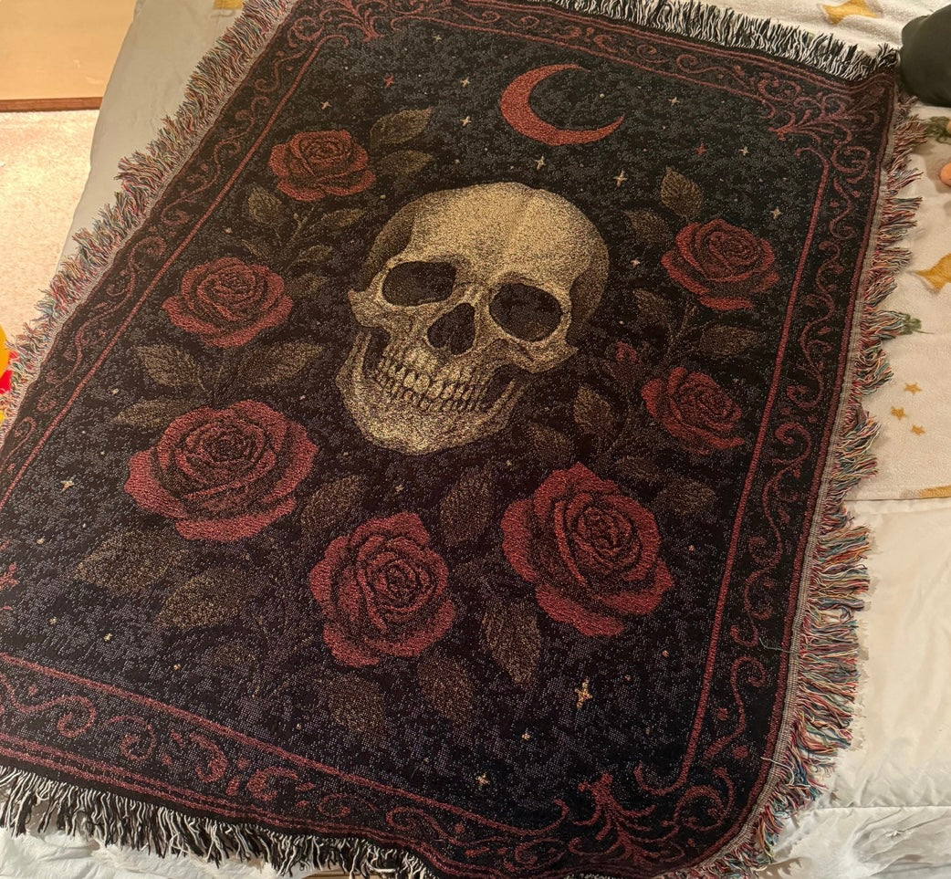 Not me falling asleep wrapped inskulls and roses 🖤😭. Honestly, this is the comfiest thing I own.