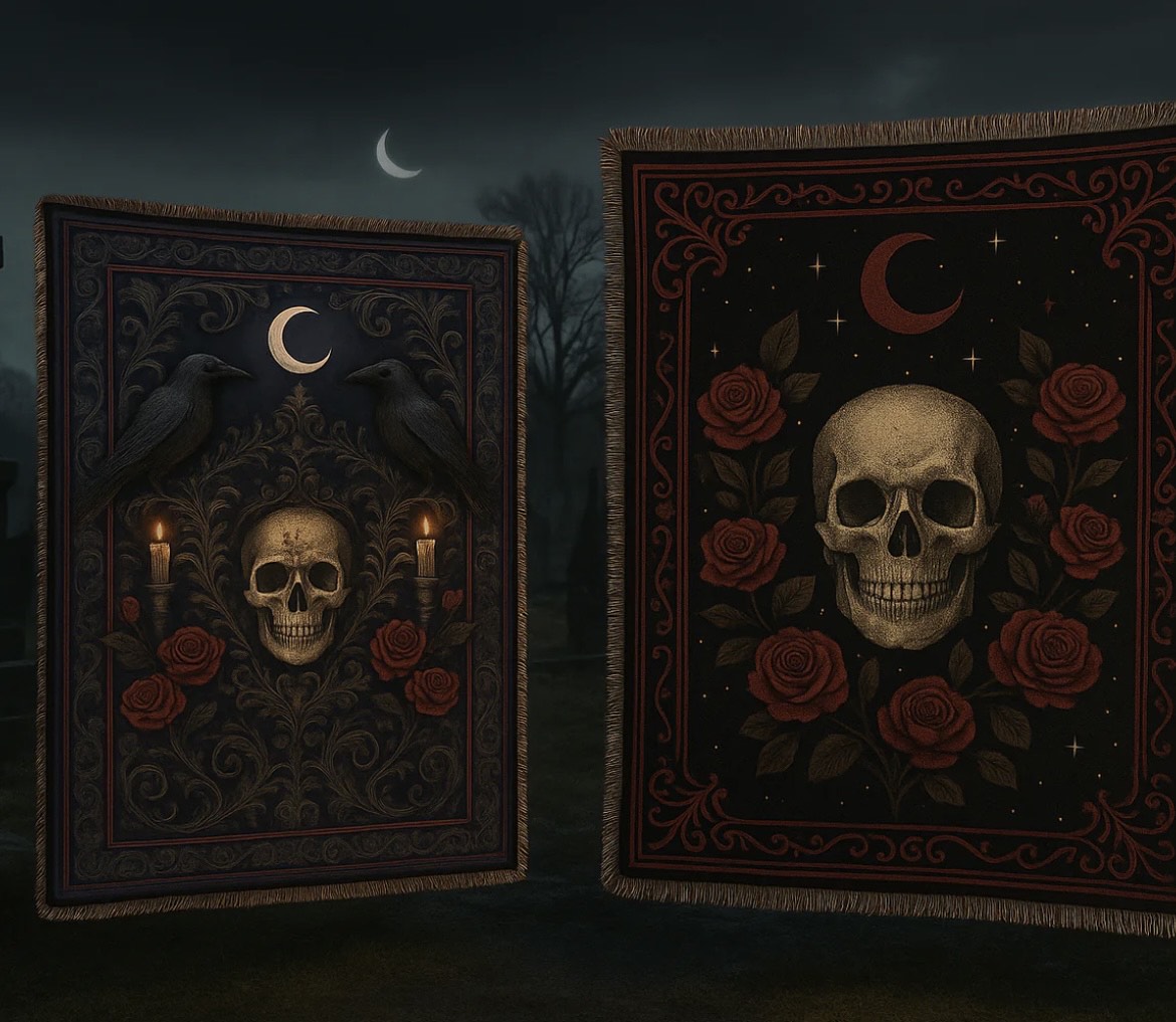 Each Goth blanket starts with over 8,000 individual threads, carefully aligned and woven on a high-tension Jacquard loom. Our design is mapped digitally, then brought to life stitch by stitch taking over 3 hours per blanket to complete.