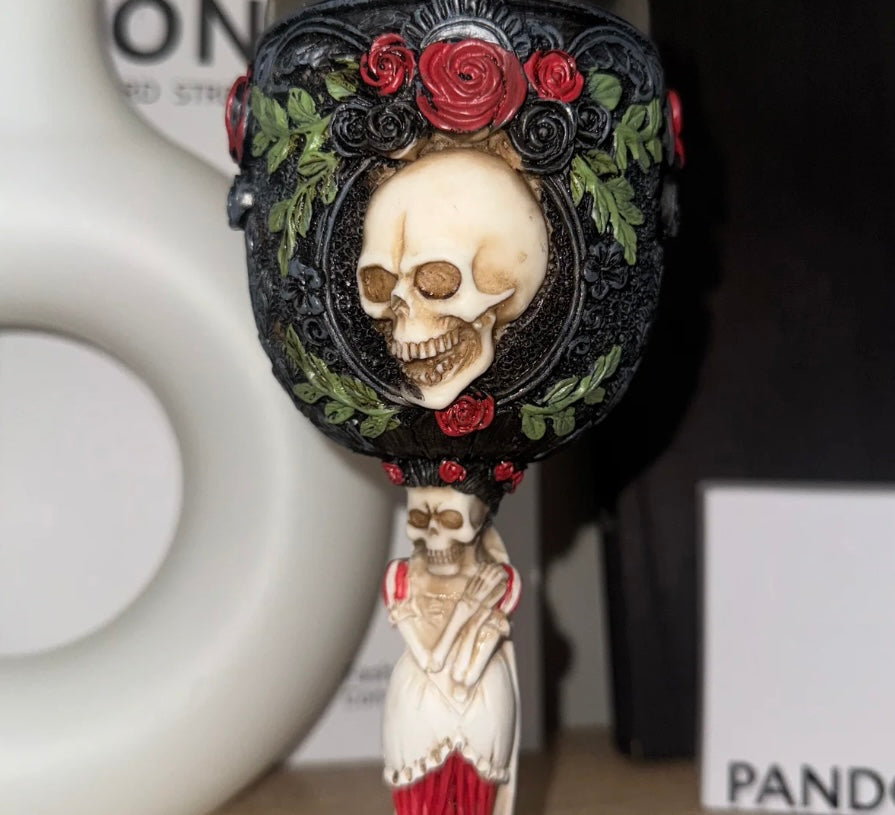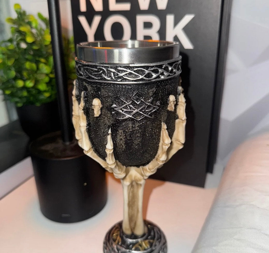 With intricate skull details and skeletal hands, this goblet is the perfect companion for your next dark fantasy evening or themed party.